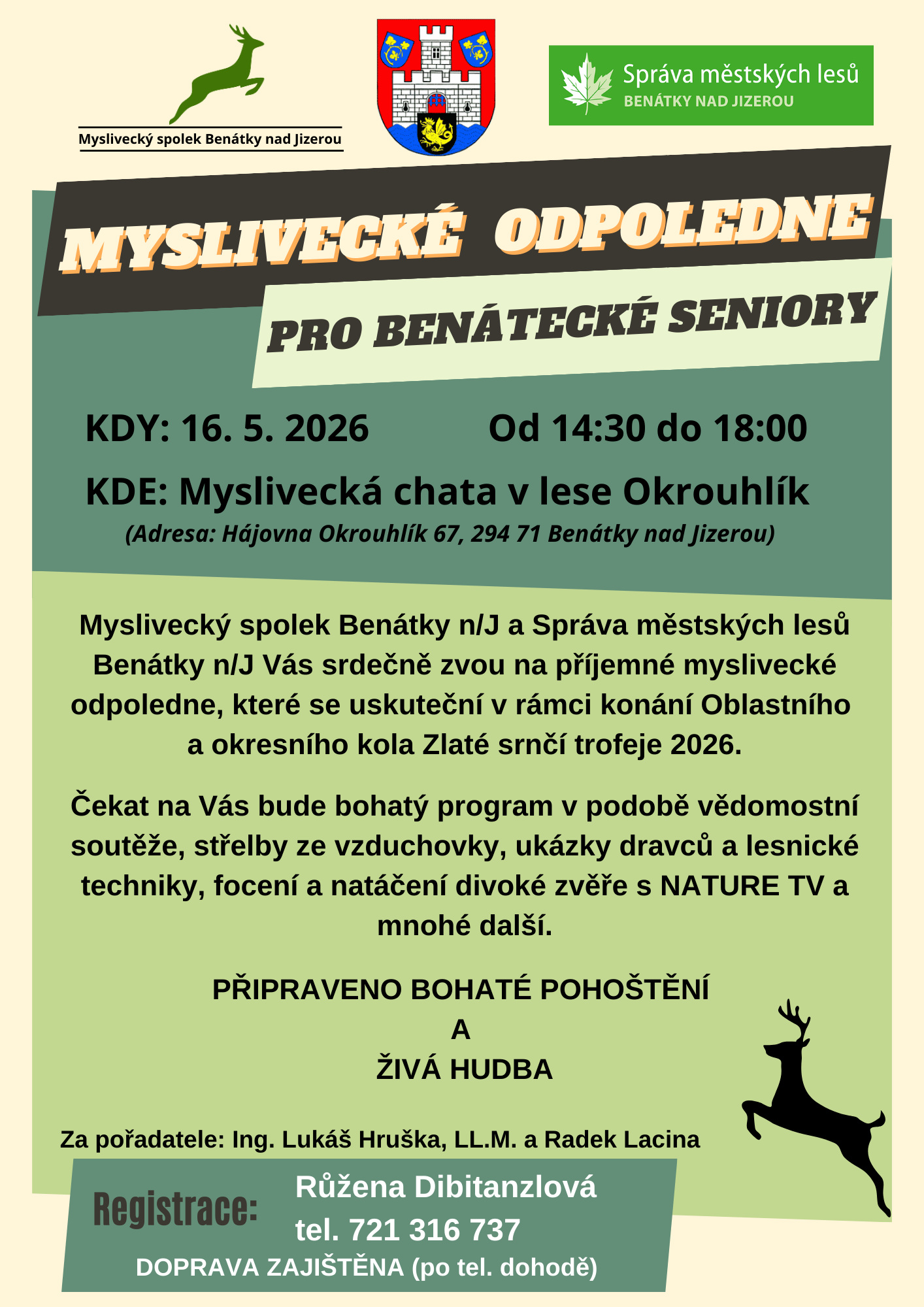 Myslivecký spolek Benátky nad Jizerou a Správa městských lesů Benátky nad Jizerou srdečně zvou benátecké seniory na příjemné myslivecké odpoledne, které se uskuteční 16. května 2026 v rámci konání oblastního a okresního kola Zlaté srnčí trofeje. Čekat na Vás bude bohatý program v podobě vědomostní soutěže, střelby ze vzduchovky či ukázky dravců, lesnické techniky a činnosti, focení a natáčení divoké zvěře s NATURE TV a mnohé další. Pro účastníky bude též připraveno bohaté pohoštění a živá hudba.